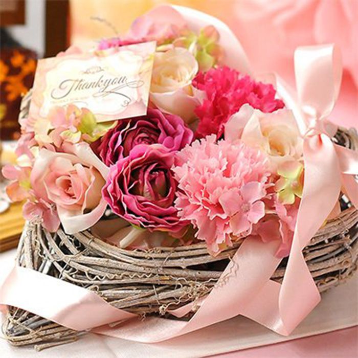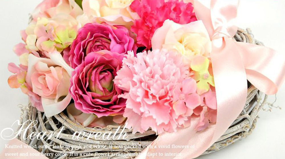 木で編んだ素朴なリースにピンクやホワイト、甘酸っぱいベリー色のビビットなフラワーを詰め込んで。アーティフィシャルフラワーを使用しているのでお手入れも簡単。リースにかけられたリボンもキュート。インテリアに馴染む華やかでおしゃれなアレンジ。用途にあわせて選べる気持ちが伝わるメッセージカード付。嬉しさも倍増です。お祝い・お礼など様々な用途で、ギフトとして最適な贈り物です。