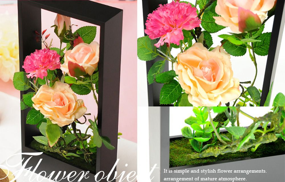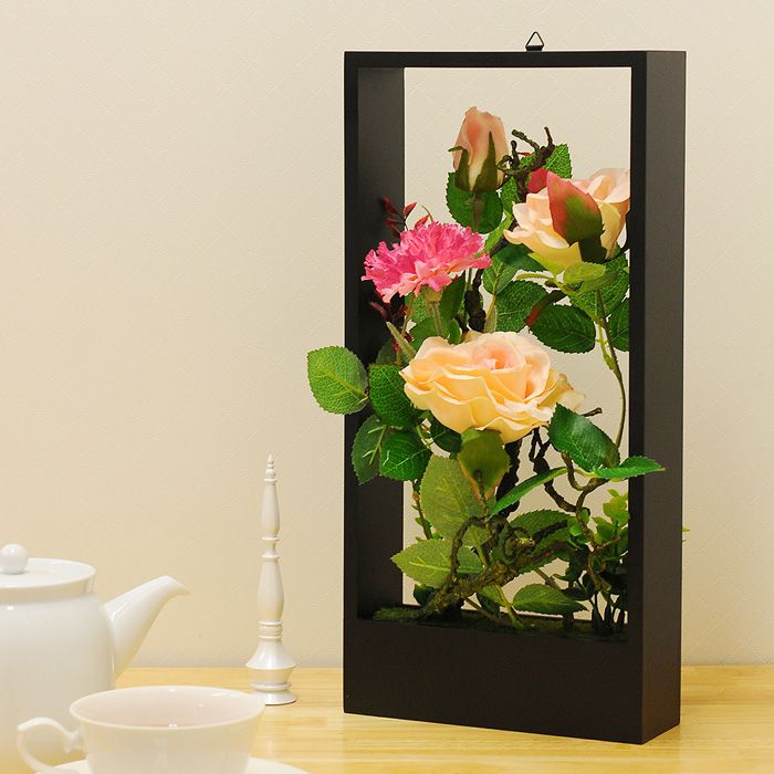大ぶりなお花とシックな木製のフラワーベース。インテリアの主役になる、美しいモダンなアレンジ。フラワーはアーティシャルフラワーで、苔や葉の表現もリアルで繊細。ブラックでペイントしたシンプルな木製ベースにアレンジした雰囲気たっぷりのおしゃれなオブジェです。置いて飾っても壁に飾ってもOK。インテリアアレンジをお楽しみいただけます。