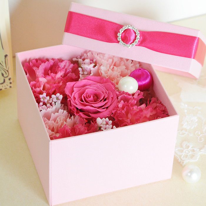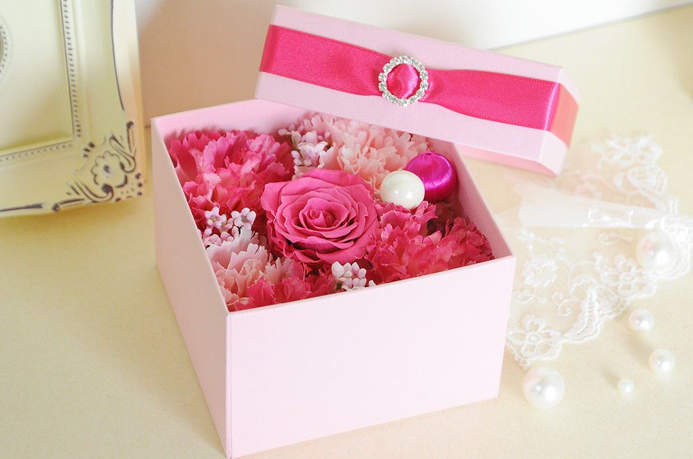 ボックスいっぱいのカーネーション(アーティフィシャルフラワー/造花)の中にお手入れなしでも生花のような美しさ、みずみずしさを長い時間楽しめるプリザーブドフラワーのローズも詰め込んだフラワーボックス。母の日にぴったりなキュートでおしゃれなギフトです。