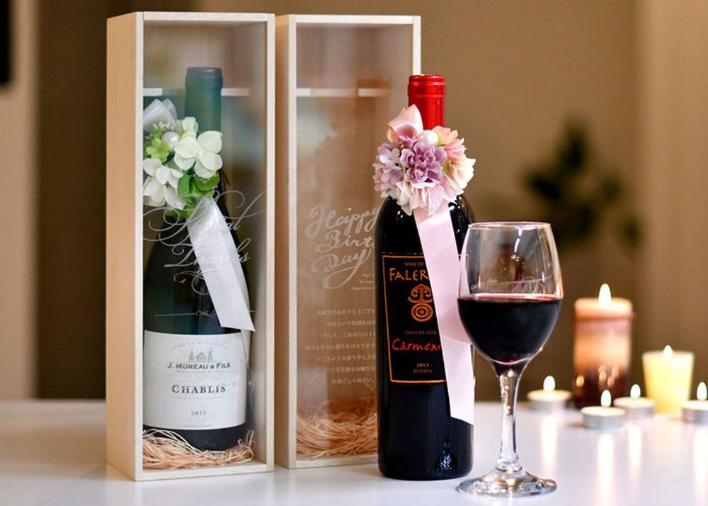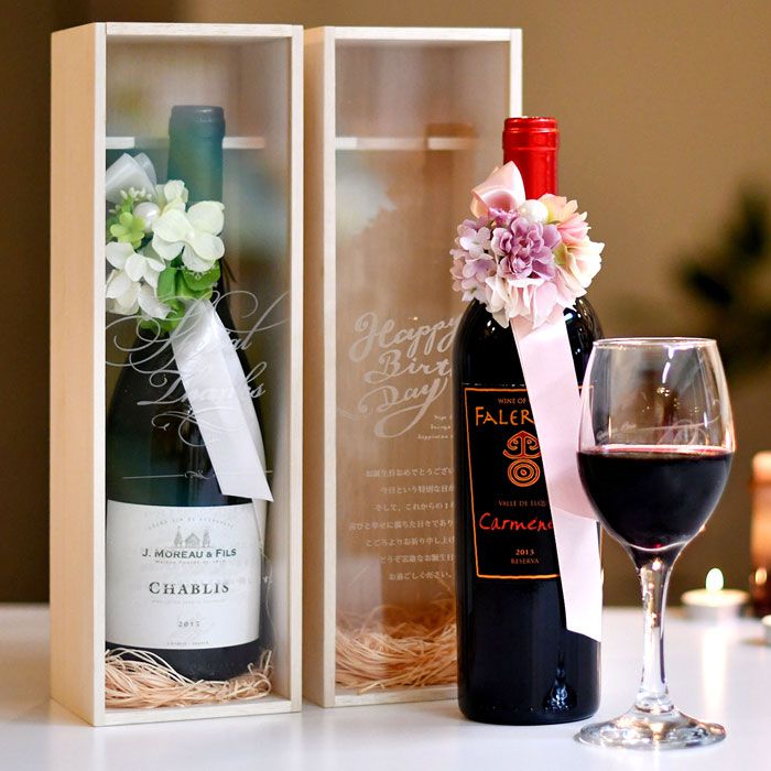 選べるフラワーアクセサリーのお花をまとっておしゃれにドレスアップしたワイン。生花リアルに再現し、生花にはない美しさを表現して造られた高級なお花“アーティフィシャルフラワー”を使用。ギフト用ボックスセットの販売なのでお好きなワインをセットして贈れます。スライド式のアクリルの蓋にメッセージをレーザー彫刻することも。ワンランク上のラッピングでグッと心に響くいつまでも心に残るギフトです。