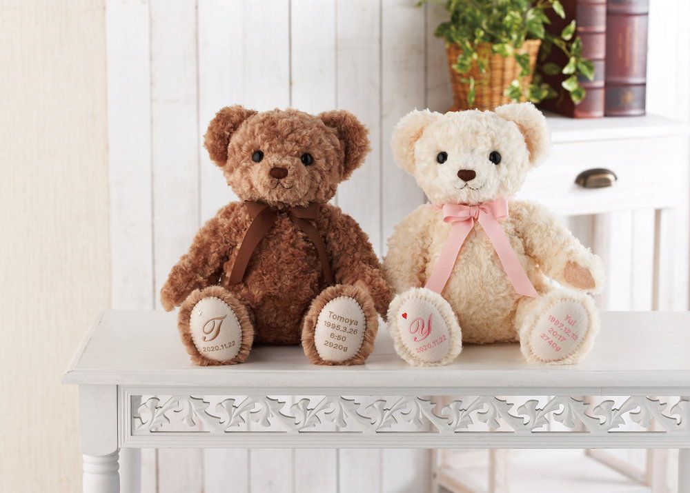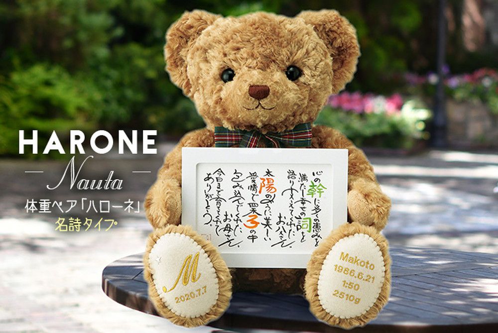 やっぱり定番のアイテムを!という場合は、自分たちの生まれたときの体重を再現したウェイトベアもいいでしょう。「生まれたときはこんなに軽かったのに、もう結婚する歳になったとは…」と、両親も感慨深く思うこと間違いなし。ちなみに最近では、新郎新婦の名を詩に織り込んだ“名詩(なうた)”と、ウェイトベアがセットになったギフトもあるよう。定番のアイテムでもオリジナリティを出したいと思っているカップルには、特におすすめです。