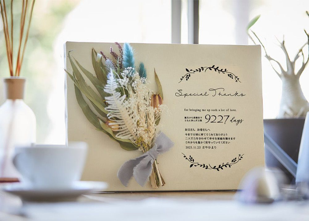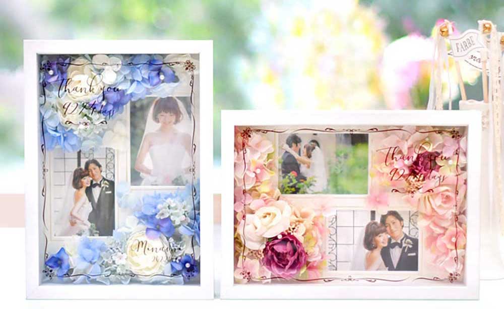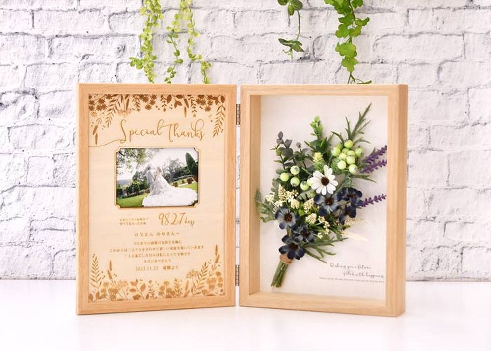 フォトウェディングで撮った写真は、自分たちで飾るだけでなく、両親への贈り物にもぴったりです。そこでおすすめなのが、フォトウェディングの写真を入れたフォトフレームのプレゼント。結婚式の両親ギフト用に、華やかなアーティフィシャルフラワーが散りばめられたものや、ウェディングソングが流れるオルゴールタイプのものなども出ています。