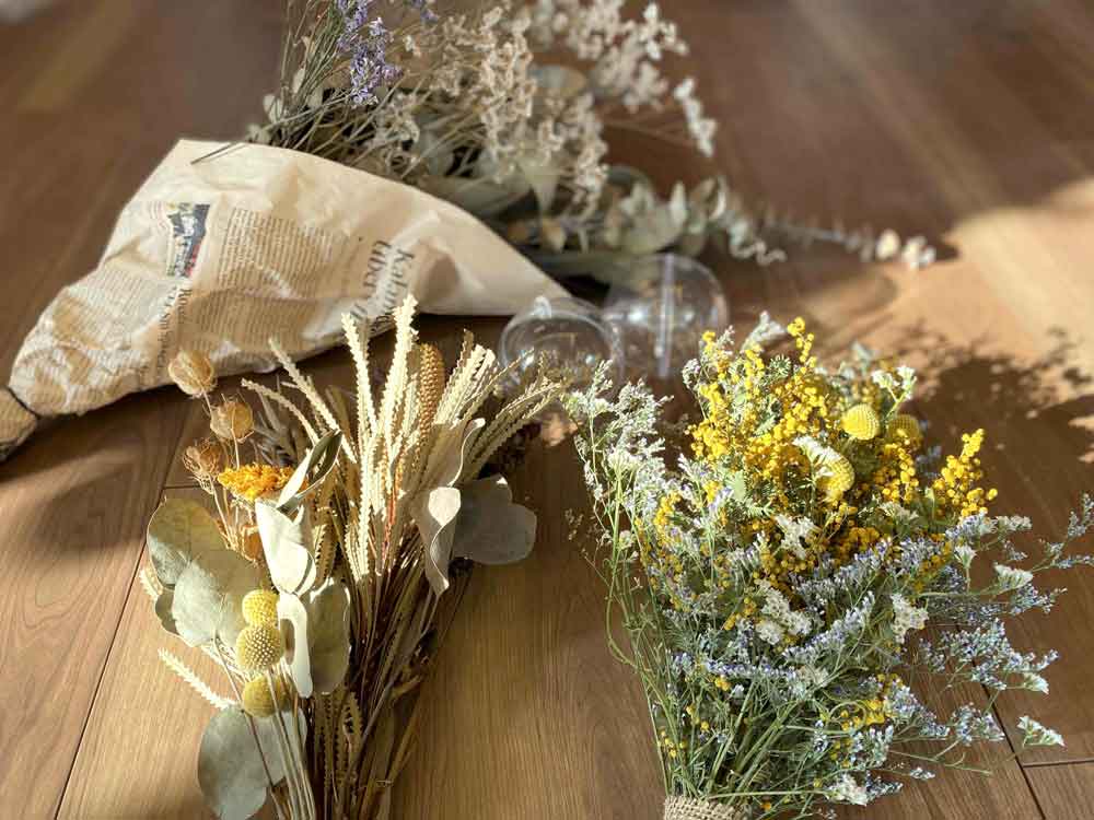 今回はサンプルDIYということもあり(最終的には家に飾る予定)、我が家にあるドライフラワーを寄せ集めてみました。