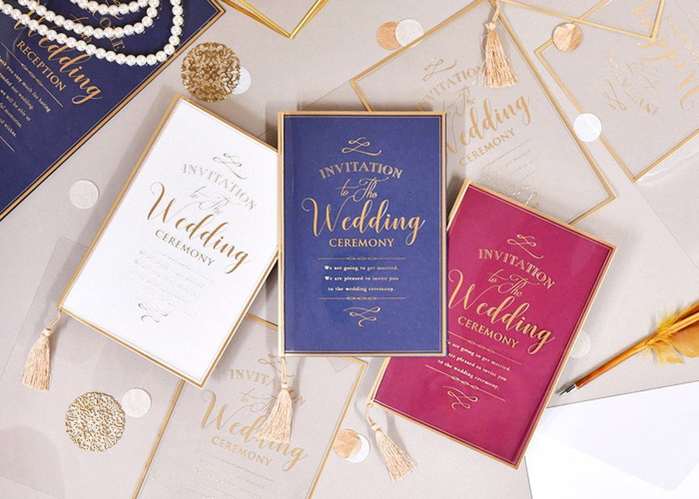 ゴールドが輝く招待状で、届いたときに一気に心を奪われること間違いなしのデザインです。クリアカバーの下に重ねるペーパーの色次第で、お好みの印象に変えられます。揺れるタッセルが高級感溢れ、プリンセス感満載ですね。