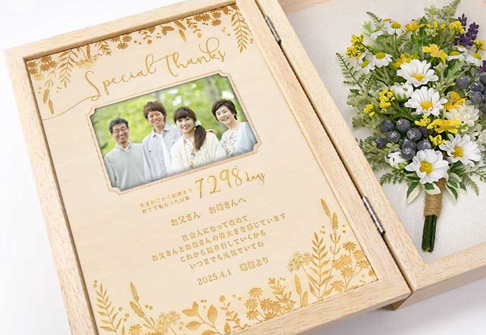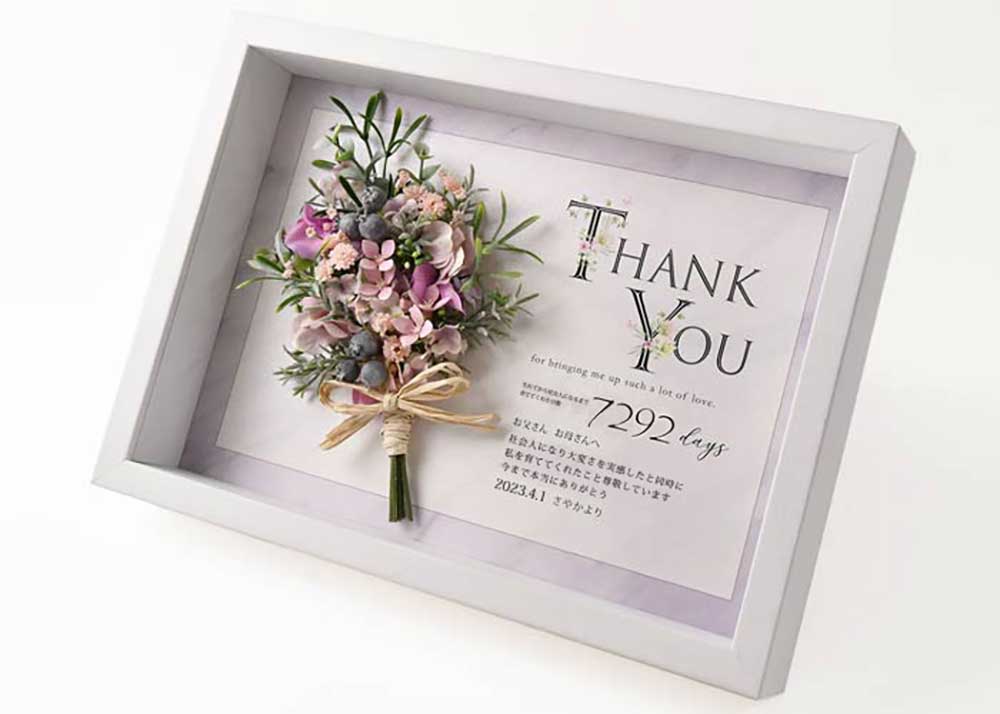 左側の子育て感謝状の部分の内容をアレンジすると、こんなイメージに。子育て感謝状で定番のカウント数字は、誕生日から社会人になるまでをカウントして入れてみるといいですね。メッセージも、これまでの感謝の気持ちやこれからの抱負などを刻むのがオススメ。ブーケ部分は、ガラスのバナーがついているので、ほこりが入る心配もなし!