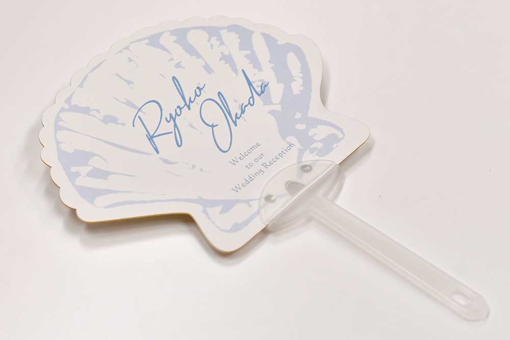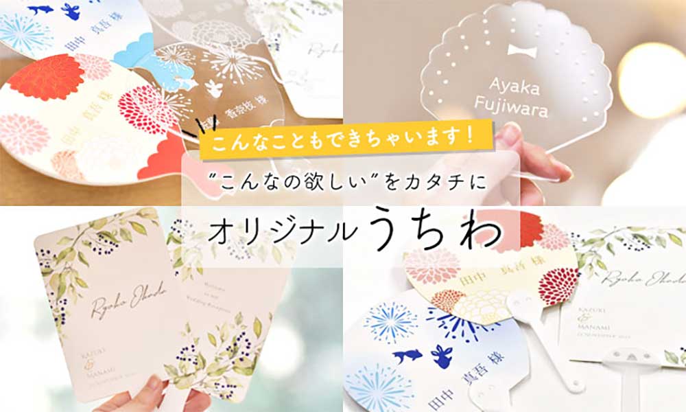 暑い季節のおもてなしにオススメなのが「うちわ」ですが、みなさんは「うちわ」と聞いてどんな形やデザインを想像しますか?ほとんどの方は「よく街中で配っているような持ち手のついたタイプ」を頭に思い浮かべるのではないでしょうか。もちろん、その形でもデザインを可愛くすることはできますし、実際そのタイプのうちわをウェディング用に販売されていたりもします。