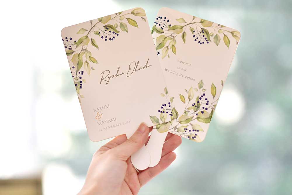 うちわとしてだけ使うのはもったいないので、名前入りにして席札として活用する方法も良いですよね!最近はこういったおもてなしアイテムにこだわる新郎新婦さんも増えているようです。