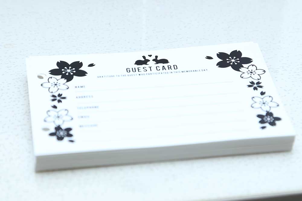 ゲストの人数が多い場合や待ち時間を短縮したい時など、あらかじめ招待状にゲストカードを当日お持ち下さいのメッセージを添えて同封しておくといいかもしれません。なかには、当日忘れてしまう方もいるので受付には予備を用意するなどの対策もしておいた方が安心です。