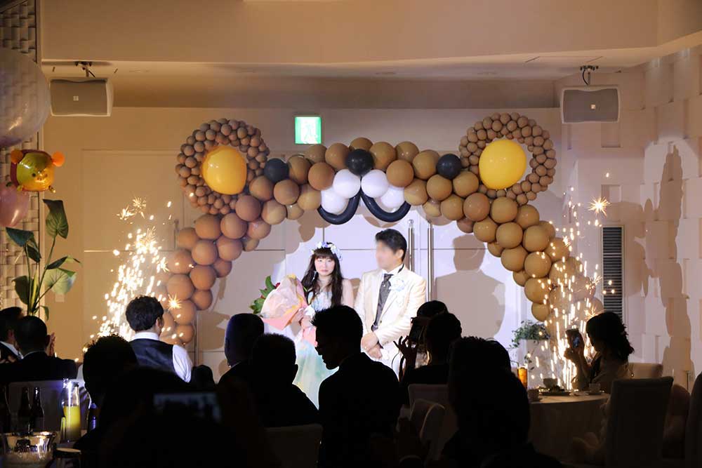 飾り付けでくまのアーチを取り入れてみたところ、ゲストから好評でした。式場でバルーン風船を注文するとき、たまたまそれが目に入り、主人に目線で訴えましたが、その場では却下され、家に帰宅したあと、「くまアーチ可愛かったなー」とぼやいたら、好きにして!と言われ頼みました。ゲストからは「テーマパーク?」とか「すごい!」と驚かれました。再入場が思ってたのと違う!というトラブルがおきてしまい、その後の笑顔が殆どなくなってしまい、写真が残念結果となりましたが、ゲストは楽しんでいただけたので良かったです。