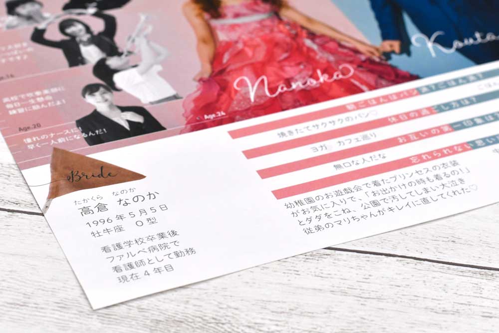 顔合せ食事会や少人数婚で配るペーパーアイテム。小人数だからこそ、こだわりの、面白いプロフィールブックが作れそう。