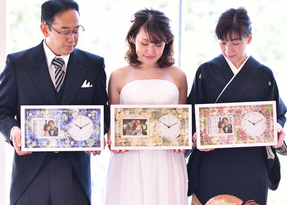 結婚式で渡す両親プレゼントの中には、フォトフレームと時計が兼ね備わったアイテムが沢山販売されています。時計を見る度に思い出の写真も見て、自分達を思い出して欲しい!という新郎新婦さまの想いを詰められるからかもしれませんね。
