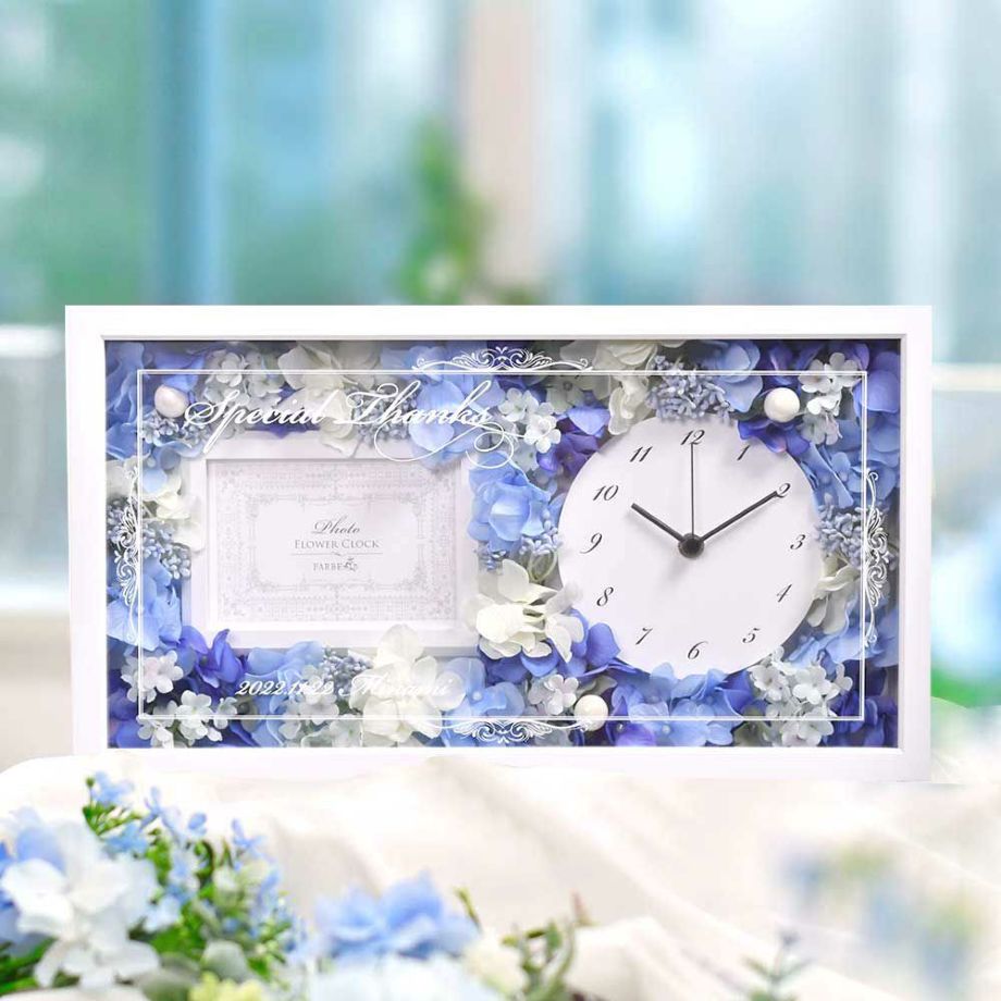 お花が沢山引き詰められた時計は、結婚式で渡すシーンがとっても華やかになります。フローリストによる絶品アレンジは、清楚なブルー、ナチュラルなアイボリー、可愛いピンクの3種類。両家と自分達用、色違いで揃えても♡