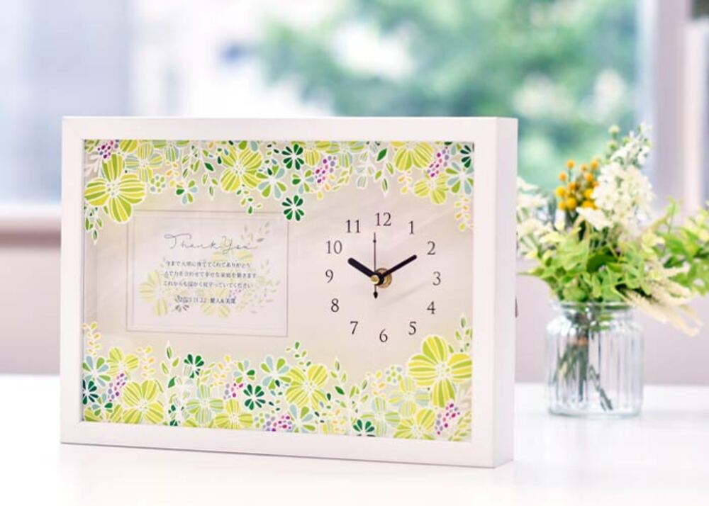 参考:お花プリントフォトフレーム時計(メッセージ付)「グリーン」