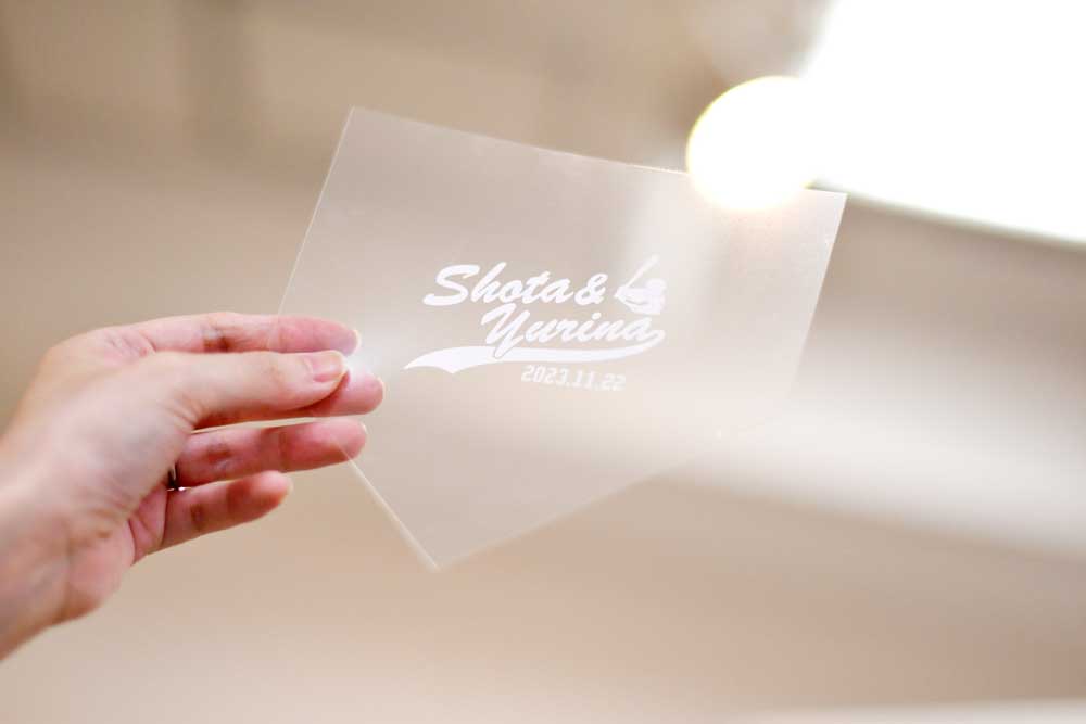 例えばこちら、野球のホームベース型になっている透明フェイスシールド。野球をテーマに考えているお二人にピッタリ。クスッと笑いもあり、まさにHAPPYWEDDINGシールドです。