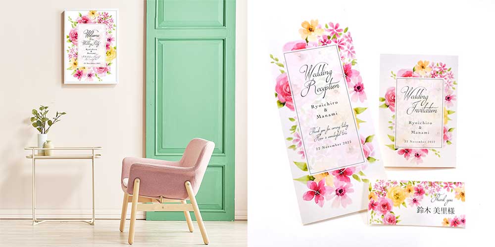 ウェルカムボードのデザインが気に入ったら、ペーパーアイテムとお揃いにできるアイテムもあるみたい。同じ柄で揃えれば、統一感のあるトータルコーデも簡単に叶うし、デザイン選びに迷った時に助かりますよね!