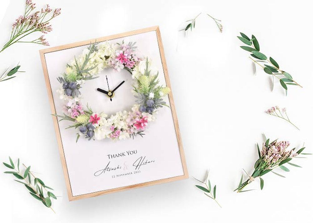 時計には、輪っかの形で終わりのないことから「永遠」をあらわすとされていて結婚式にぴったりなリースをアレンジ。アーティフィシャルフラワーだから、耐久性にもすぐれているので、枯れてしまう花束とちがって美しいまま記念に残すことができます。時計の木枠には無垢材を使用。ナチュラルでぬくもりある無垢の風合いが、シンプルな文字やリースアレンジにベストマッチ。”ありがとう”の想いをこめた、やさしさ溢れるたたずまいです。