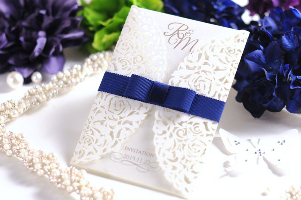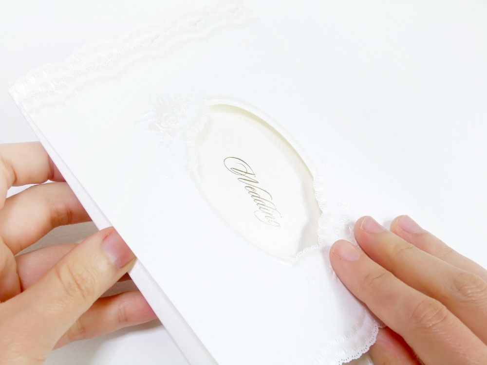 繊細なバラのレースに包まれた招待状。まるでウェディングドレスを思わせるデザインに、受け取ったゲストは思わず見とれてしまいます♡台紙は上品に輝くパール紙。ネイビーのリボンがアクセントになって、より華やかな印象に。