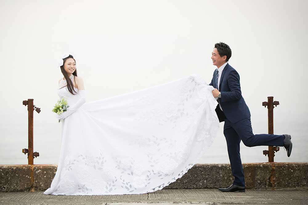 タイミングよく一緒にジャンプしないと上手く撮影できませんが、撮影できた写真はとっても楽しそう♪躍動感もあるし、きっと自然な笑顔の写真が撮れること間違いなし!結婚式当日は撮影しにくい写真だと思うので、前撮りならではのショットかも。