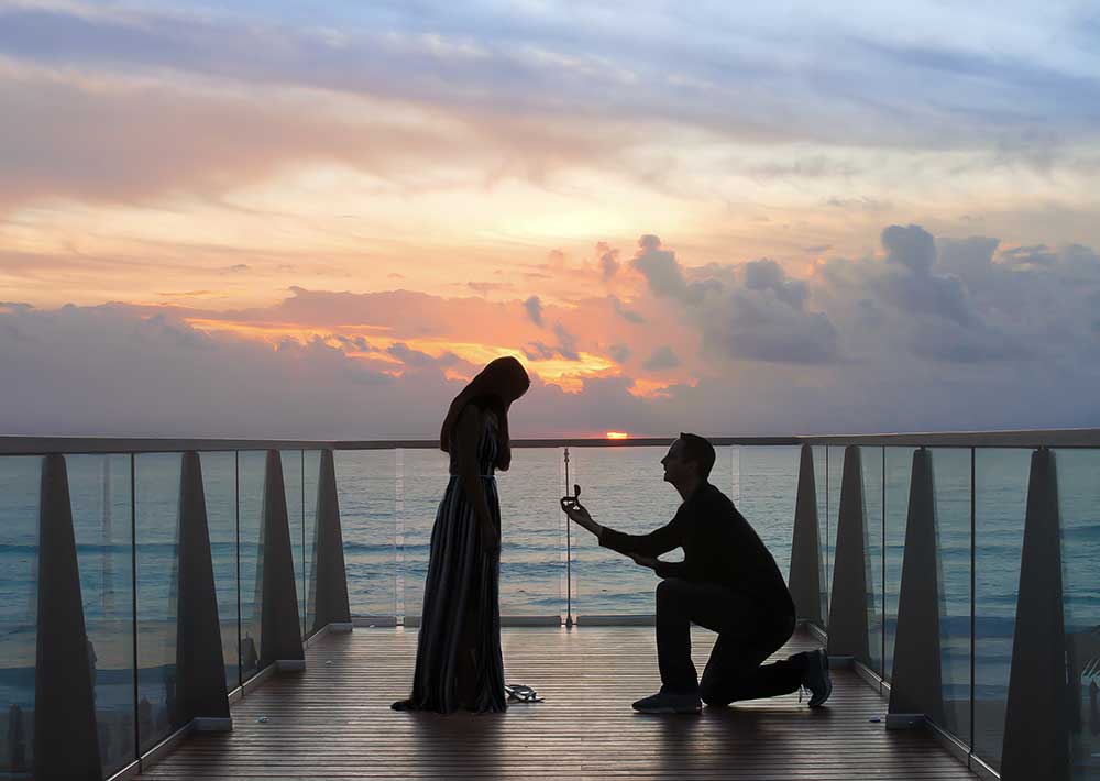 プロポーズを再現するショットも人気です。膝まづいて、リングBOXをパカっとやるシーン、まるで映画のワンシーンみたいですよね♡こんな時じゃないとできない…というようなポーズも、前撮りならではのテンションでやってしまいましょう!ロケーションフォトは天候に左右される部分が大きいですが、青空や海辺、夕焼けの中のシルエット写真など、少しドラマチックな演出をして撮影するのもオススメです。