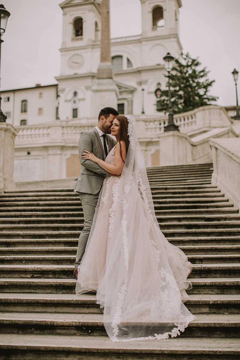 教会の階段部分や、エントランスなどの階段を利用して、ドレスのトレーンやベールを美しく魅せるショットも人気です。卒花さんサイトなどでも撮影画像としてよく見かけますよね。ウェディングドレスはバックショットも美しく作られているものが多いので、花嫁さんの振り返りショットは是非撮影して頂きたいです。