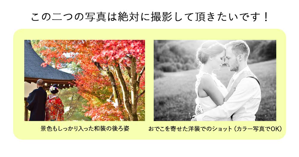 あと、撮影するチャンスが一度きりとなると、どうしても「あれもしたい」「これもしたい」と欲張りになってしまいますよね。けれど、要望がたくさんありすぎると、カメラマンさんもそれに応えるのが大変…。相手もプロなので、お任せする部分はお任せして、「どうしてもこれはお願いしたい」という部分を簡潔に分かりやすく伝えると、そのポイントを押さえて撮影してくださるはず。分かりやすさはもちろんのこと、こだわりすぎたり欲張りすぎたりすると、逆に撮影がスムーズにいかなくなる場合もあるので注意が必要です。