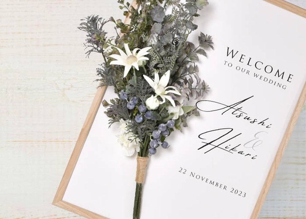 こちらは、くすみ色のスワッグがアレンジされたウェルカムボード。ポイントの白いお花がモスグリーンのアースカラーをより一層引き立ててくれます。