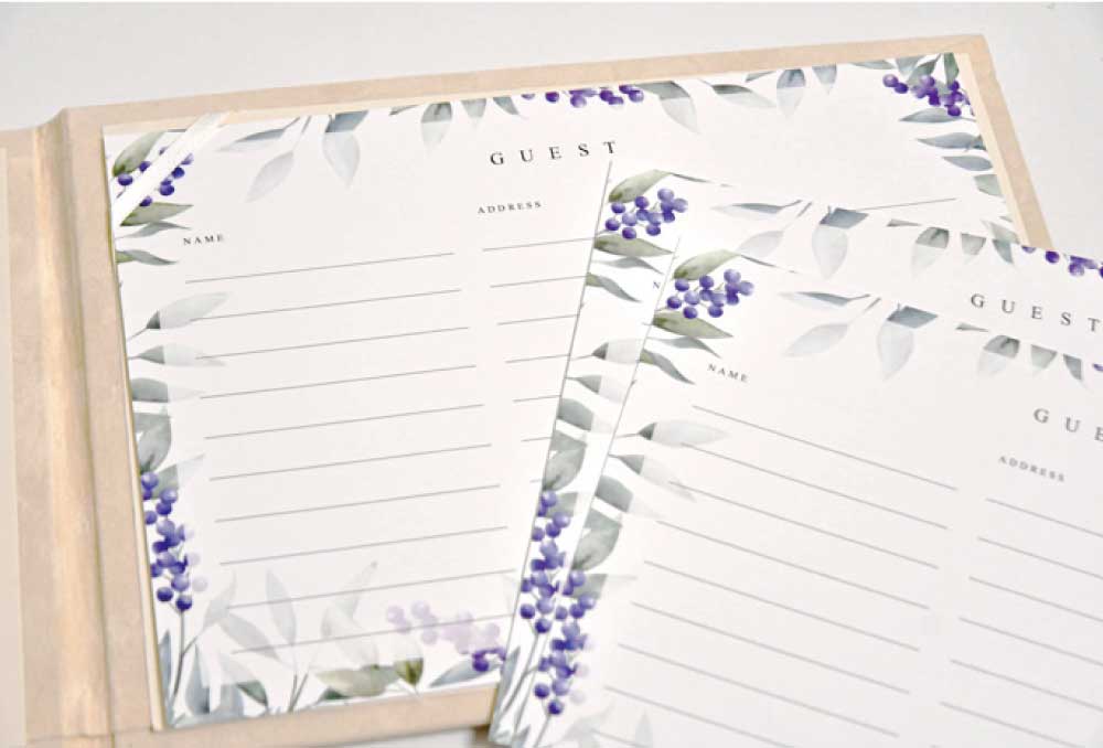 ベロア調のアイボリーの台紙に、シートを挟むタイプの芳名帳。リーフとベリーにアースカラーを取り入れたナチュラルなデザインです。記入するのはお名前と住所だけのシンプルなタイプです。ベロアグラフィックゲストブック「リーフ」参考:ベロアグラフィックゲストブック「リーフ」