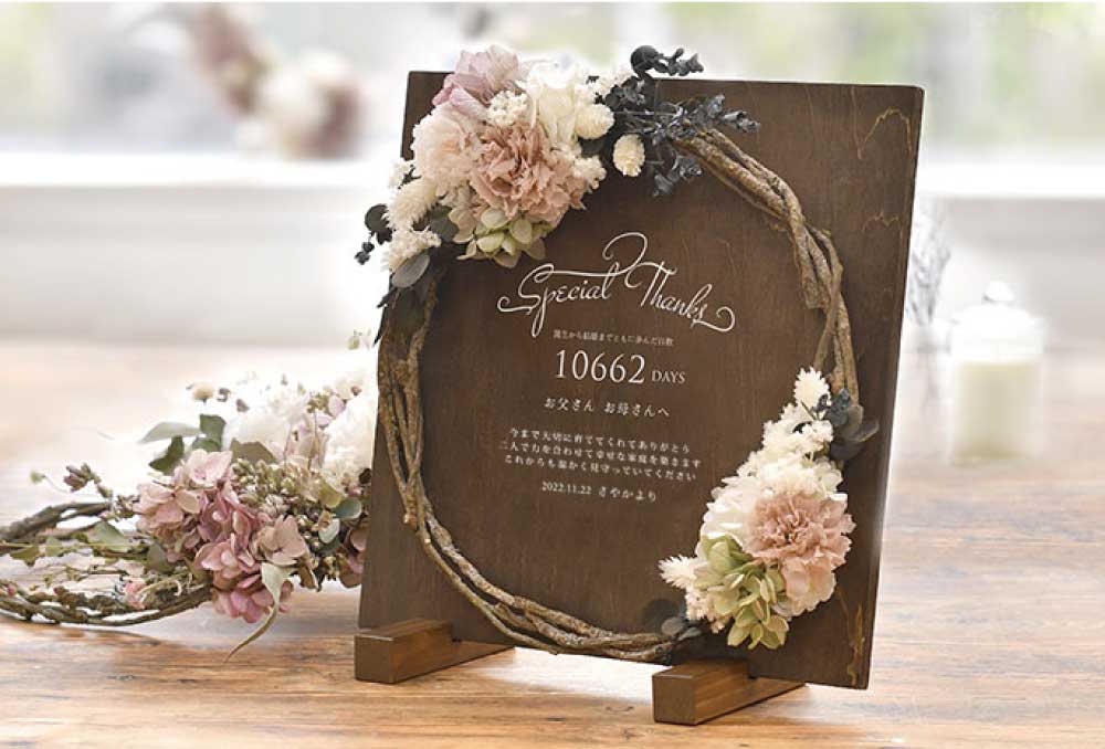 こちらは、白いキャンバスの感謝状。スモーキーなカラーのスワッグブーケがとってもカワイイですよね。こちらのスワッグブーケはドライフラワーとアーティフィシャルフラワーをミックスしているので、より自然に近いフラワーアレンジになっています。「今まで育ててもらった日数」や感謝のメッセージも入り、内容も充実しています。