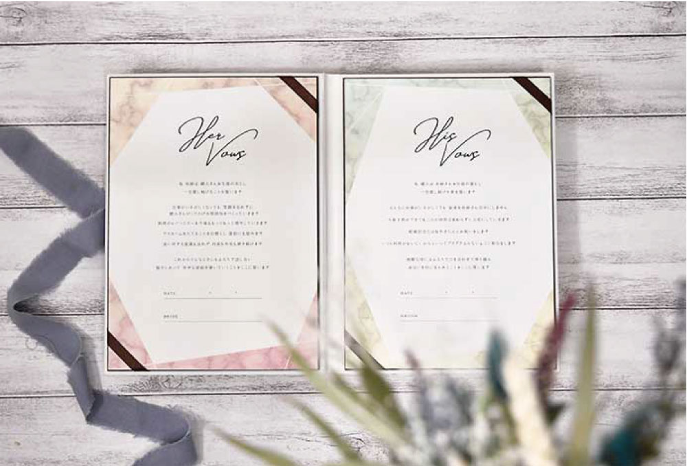 こちらは、大理石の模様がオシャレな結婚証明書。海外で主流のWedding vow booksみたいに、新郎新婦が約束事を誓いあうタイプです。新郎側がグリーン、新婦側がピンク基調の大地を感じさせるカラー。サインも新郎新婦だけなので、withコロナの結婚式でも使い易いタイプです。