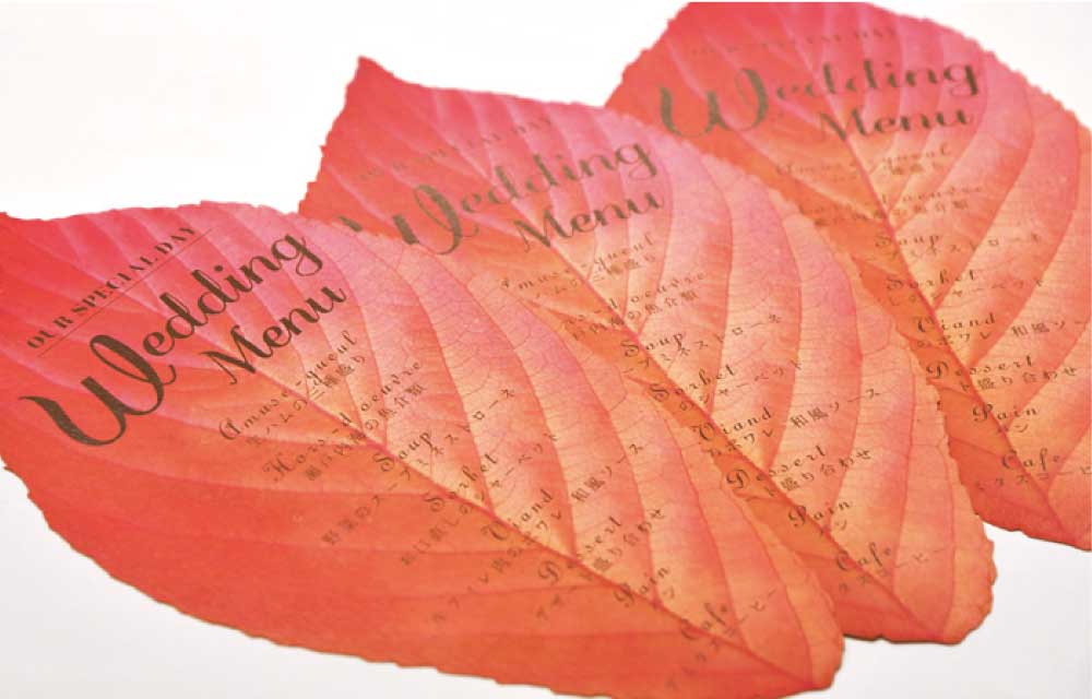 テーブルコーディネートに取り入れるアイデアとして、ナプキンではなく、メニュー表や席札で華やかさをプラスしてみるのも。太陽のように美しいオレンジ色のメニュー表は、本物の葉っぱそっくりで自然を感じさせてくれます。