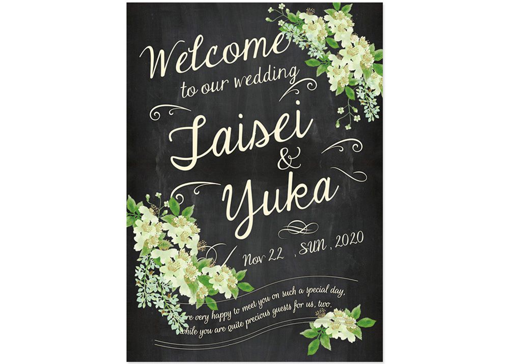 ウェルカムボードは、最初に目に入ってくるウェディングアイテム。ナチュラルさとグリーンを感じる黒板風ボードはいかがでしょうか。黒板を何度も消して書き直したようなかすり跡によって、よりステキな風合いになっていますね。周りを緑で縁取ってもかわいいですよ。