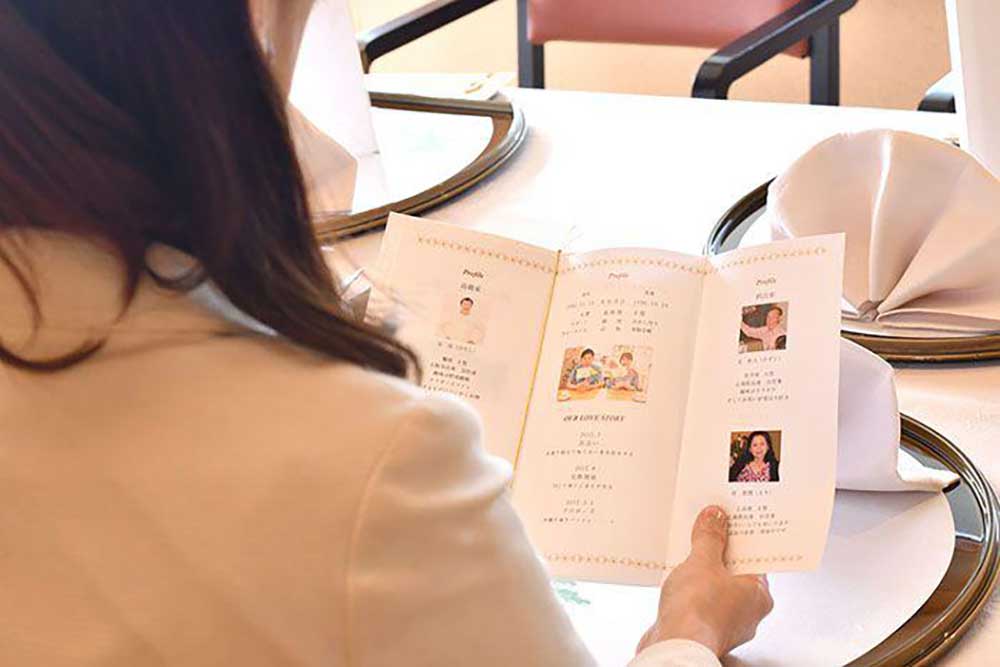 両家初顔合わせの場合、どんな話題で話したらいいか緊張してしまいますよね。そんな時に役立つのが「顔合わせ食事会しおり」です!食事会当日の流れ、お二人の結婚に向けての準備、お互いの家族のことなどが分かるペーパーアイテムなので、そのしおりを元に話のきっかけが出来て助かった!という卒花さん達の声もよく耳にします。当日、話のきっかけをどういう風に作ったらいいか不安…という方は、話題の種まきとして準備しておくと安心ですよ。