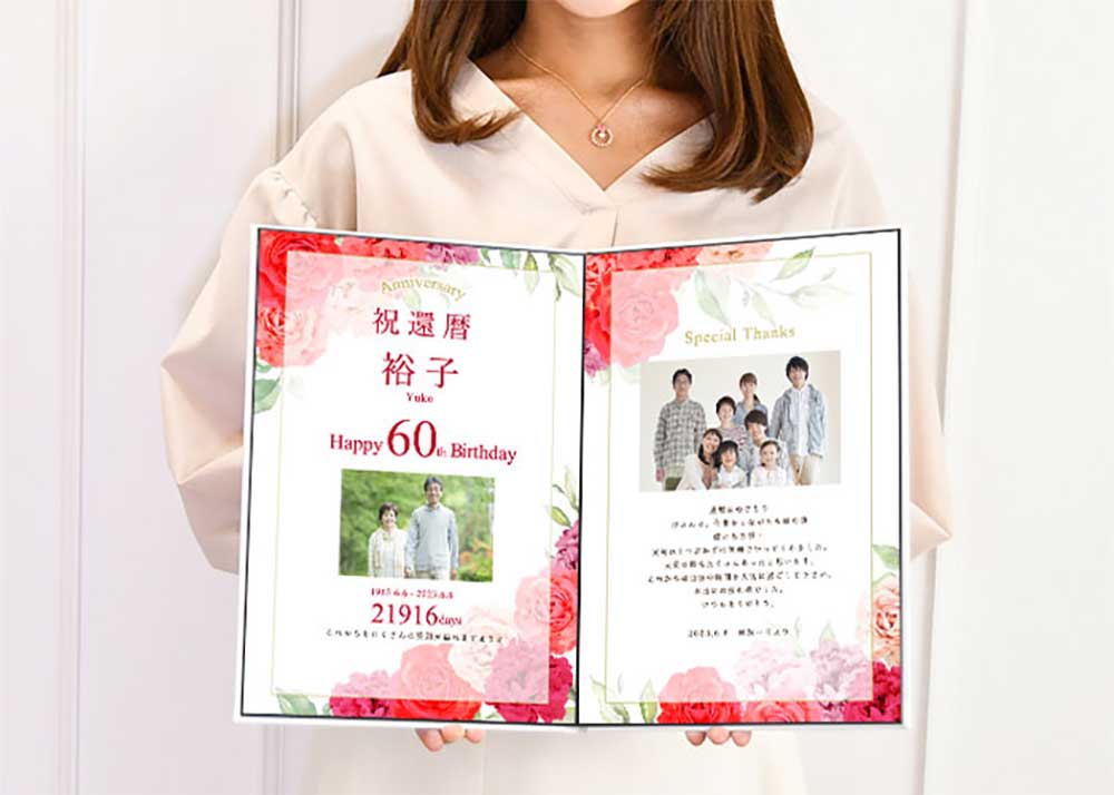 フォトフレームと同様におすすめなのが、こちらのメモリアルブックです。右面には、「祝還暦」の言葉や名前、還暦を迎える大切な人の写真を、左面には寄せ書きメッセージまたは写真+オリジナルメッセージを入れられます。赤いバラの絵柄が白い紙に映えてとてもきれいですよね。