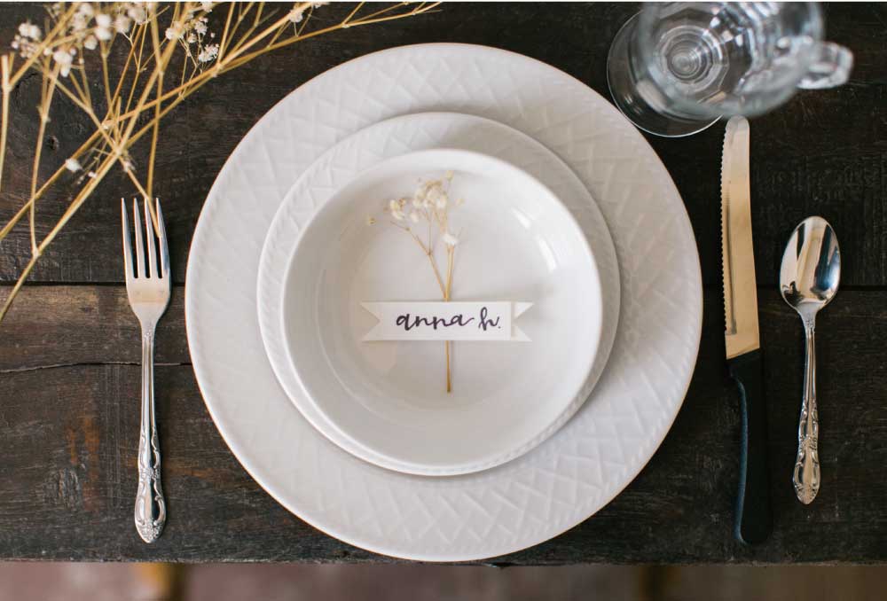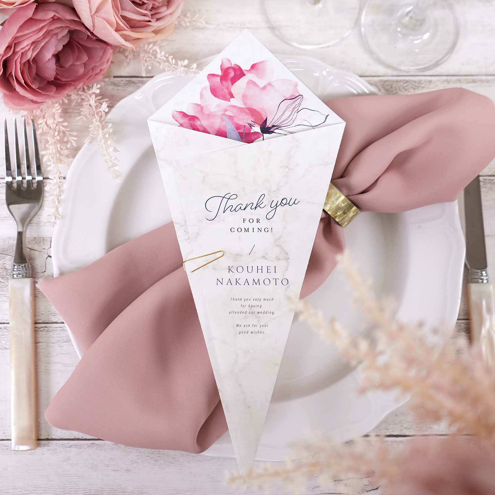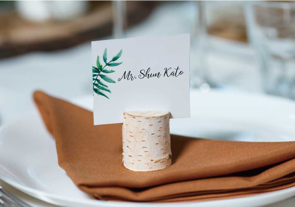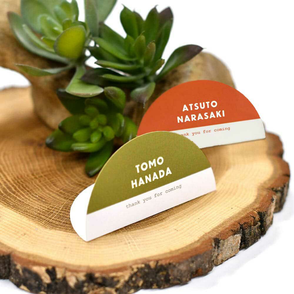ゲストの席を示す席札。来て頂いたゲストのお名前の間違いは、日本語でも英語でも失礼なことなので、細心の注意を払って用意しましょう。読み方や表記が不安な場合は、事前に確認を取ってから作成する方がベター。また、名前のミスが無いか、敬称が間違ってないかなどの最終チェックを、席札が完成した後にも必ずしましょう。
