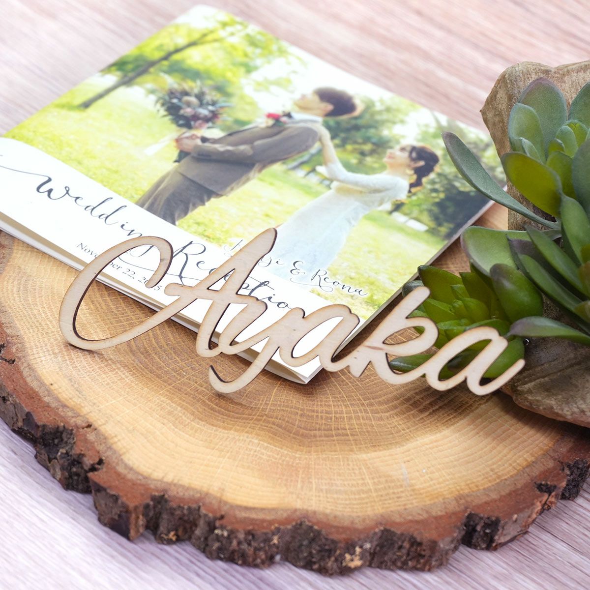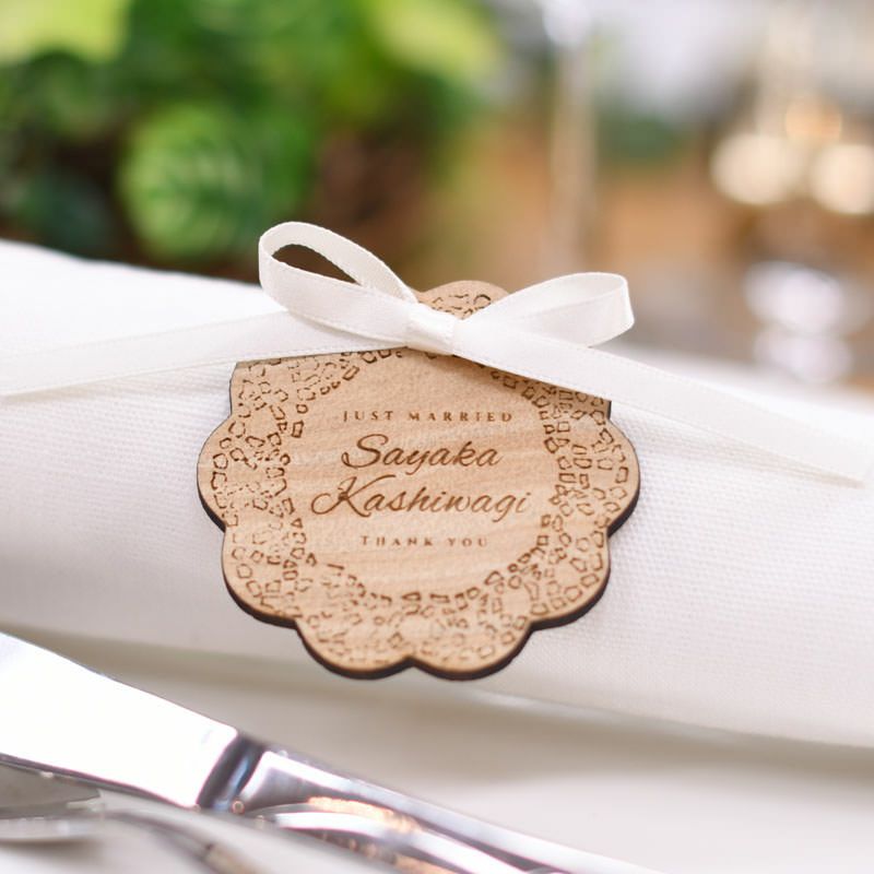 ウッド素材にゲストのお名前を彫刻して仕上げた席札