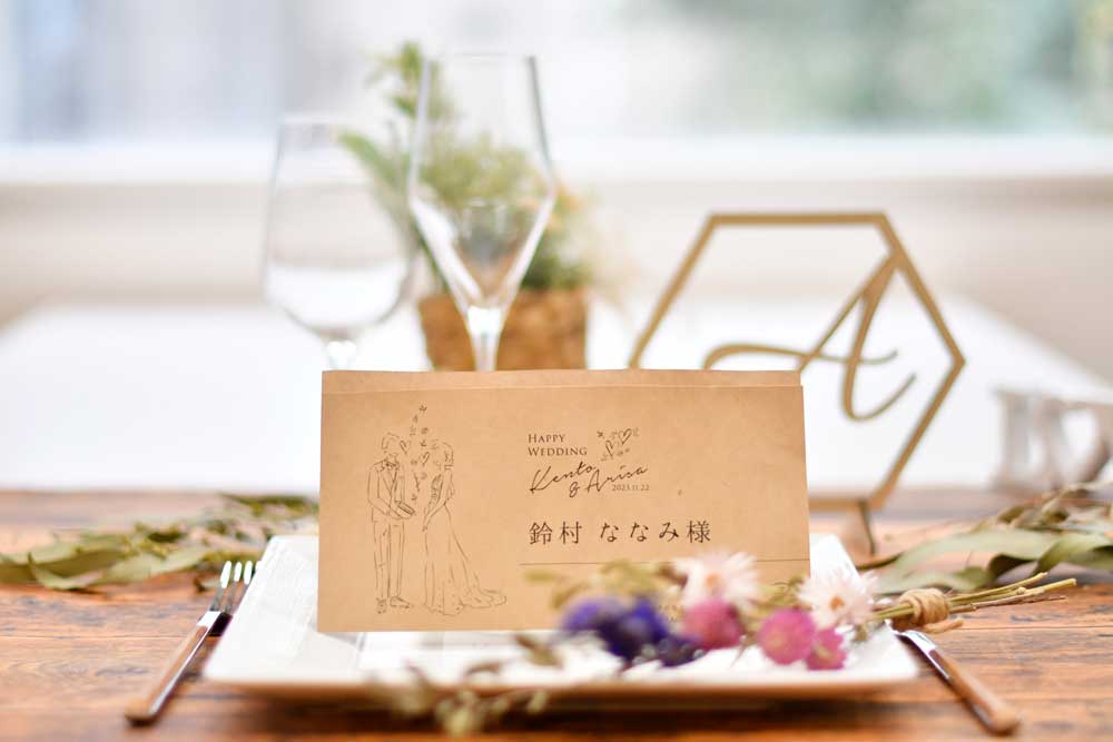 マスクをつけての参加がノーマルスタイルとなっている今、マスクを外した後、その置き場所って地味に困りませんか?そんな時、席札がマスク置きになっていたら助かりますよね!withコロナ時代のおもてなしをいち早く取り入れている、新郎新婦さんのおもてなしの気持ちはきっとゲストの方々にも伝わるはず♡このドレス&和装の新郎新婦さんが描かれている線画のデザインも可愛すぎます♡♡