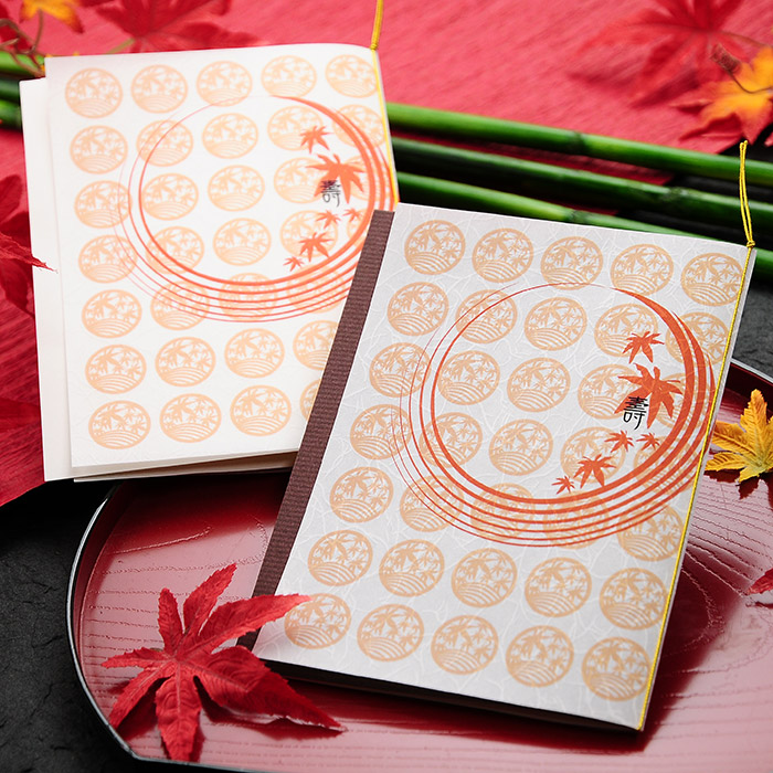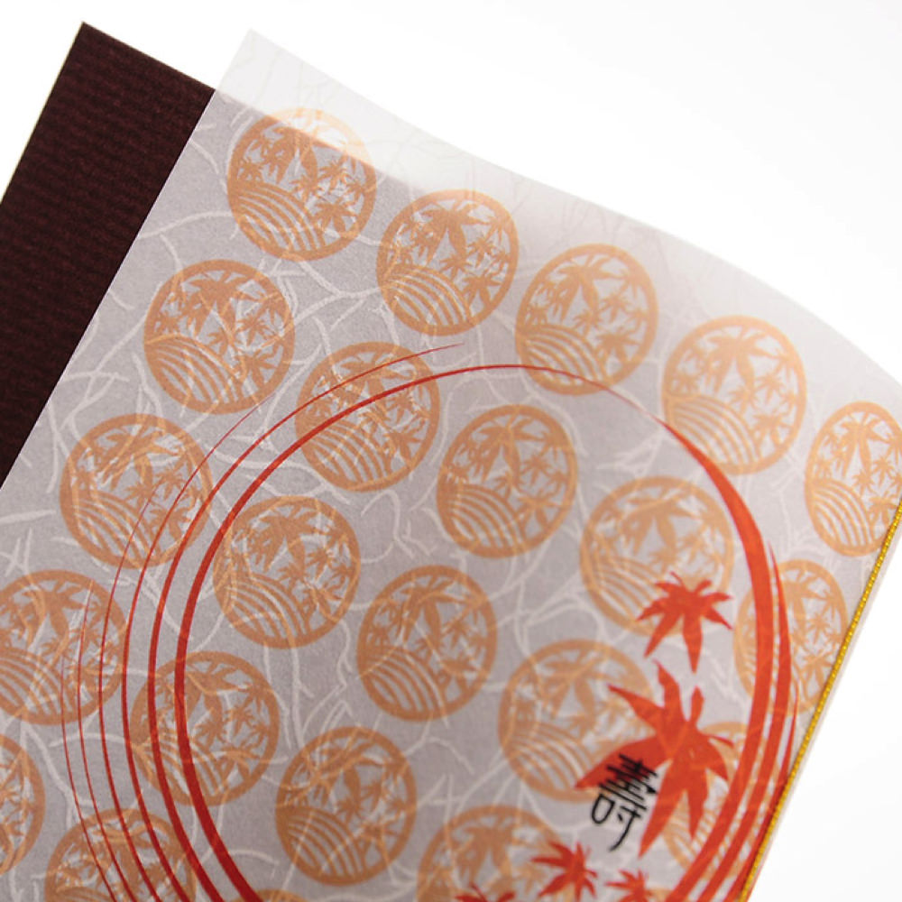 もみじの模様をあしらったトレーシングペーパーと質感の豊かなカラーペーパーを重ねた上品な印象の招待状。台紙はホワイトとブラウンの2色から選びます。