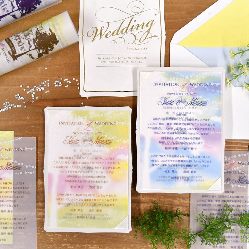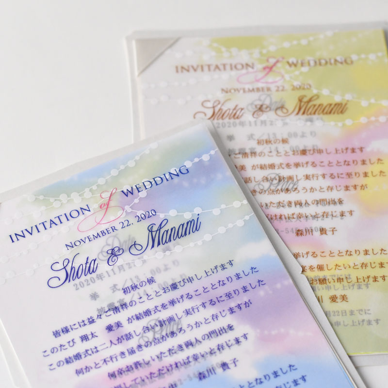 トレーシングペーパーを重ね使いした透け感と水彩画調デザインが幻想的な印象に。台紙の左上と右下につけたリボンに、本状を差し込んで留めるスマートなスタイルもすっきりとして魅力です。