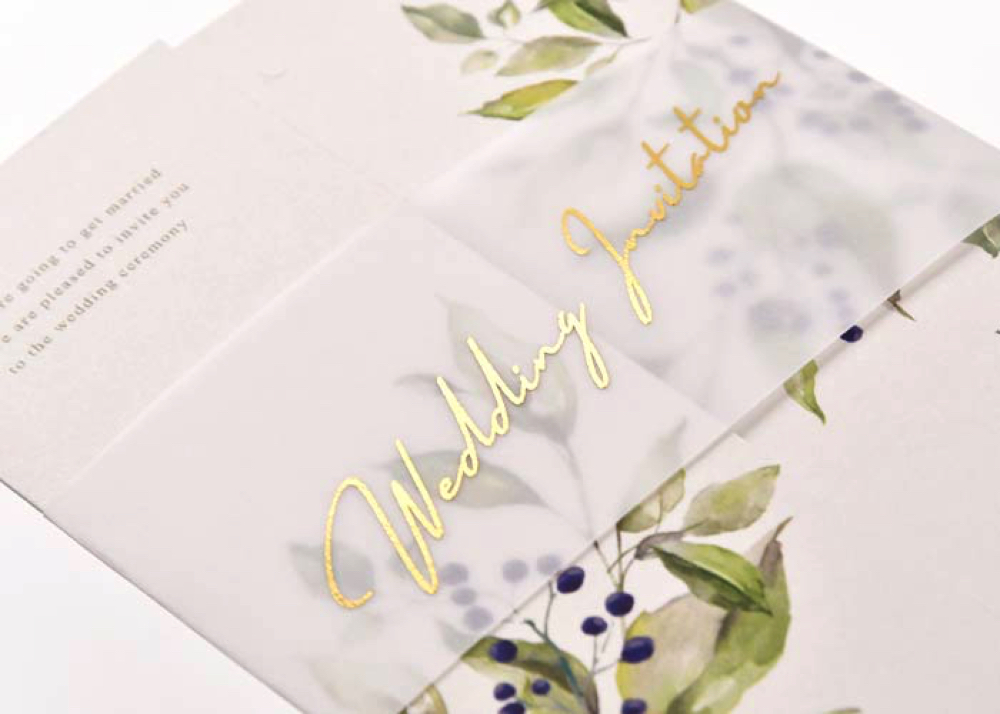 こちらはシンプルな、やさしい透け感のトレーシングペーパーにホワイトインクをのせたシンプル&スタイリッシュなデザイン。このほか和洋・華やか・かわいいなど、全6種類からお選びいただけます。