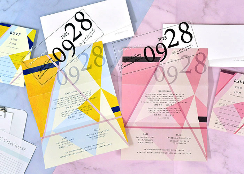 重たくなりがちなベタのバイカラーに、シャドウカラーを添えてくれるクリアシートをプラスすることで軽やかさが生まれます。大胆なレイアウトの挙式日が爽やかでモダンなデザインに。