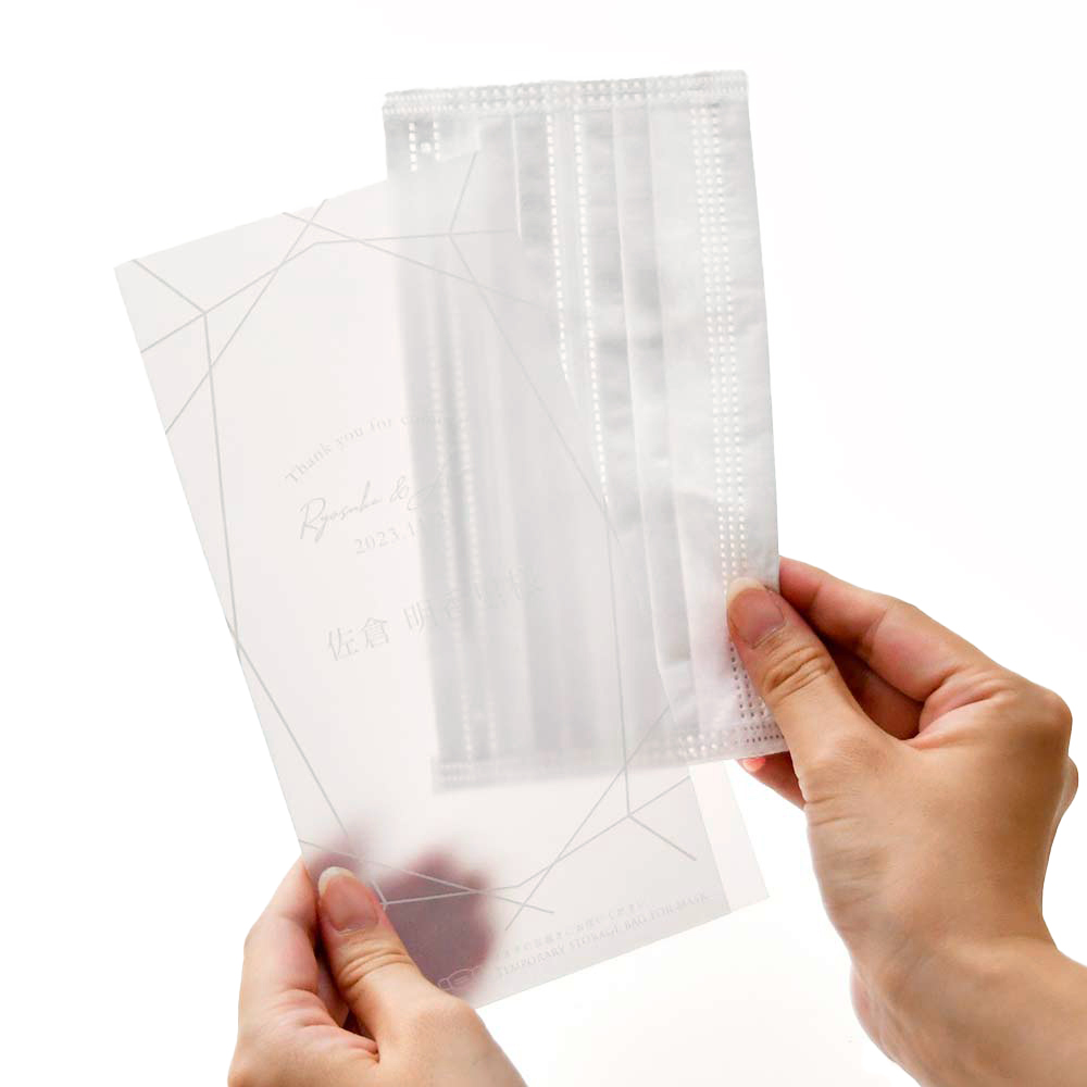このほかにも、感染拡大防止のために当日取り入れたい心配りなアイテムがあります。当日になって初めて「あ、どうしようかな?」と思うのが、ゲストさんみんなが式場までつけていらしたマスクの置き場所です。