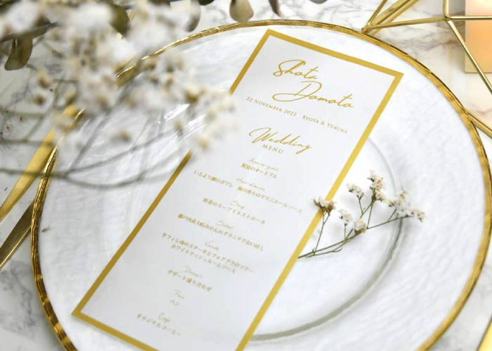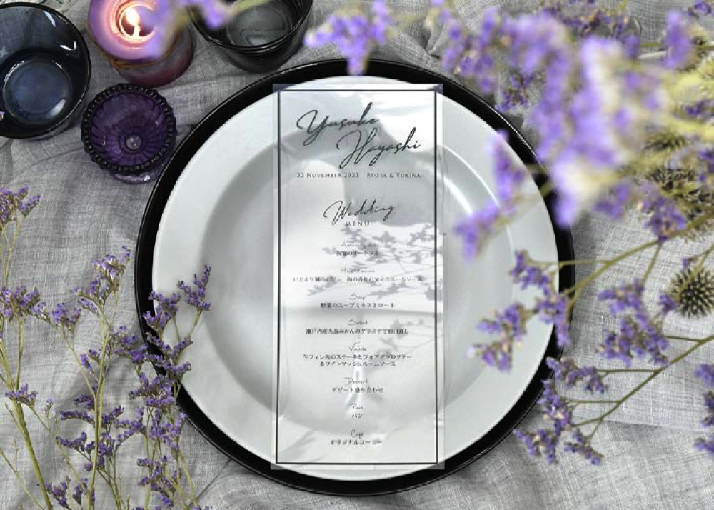 ミニマルデザインの席札を兼ねたメニュー表。シャープな黒の輪郭線を合わせる事で、輝きが一層増して、クリアなシートに視線が集まります。