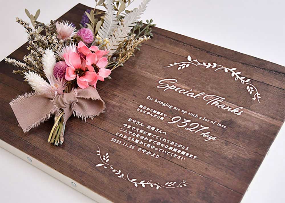 感動のシーンを彩る贈呈アイテムも、ダークブラウンなら気持ちを落ち着けて渡すことができそう。人気のスワッグブーケとの組み合わせでトレンド感もプラスして。