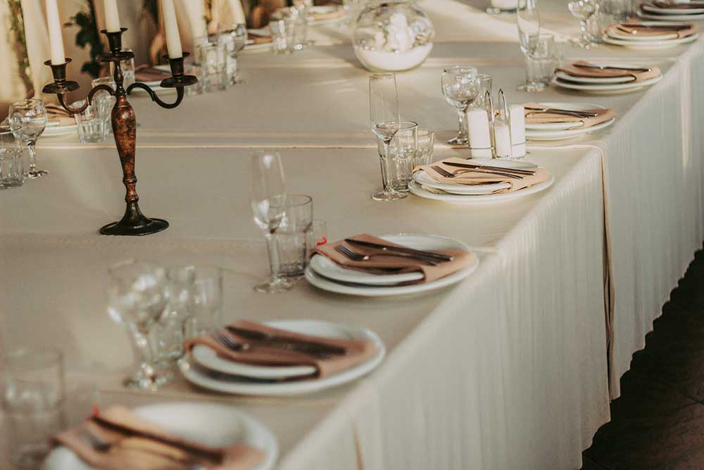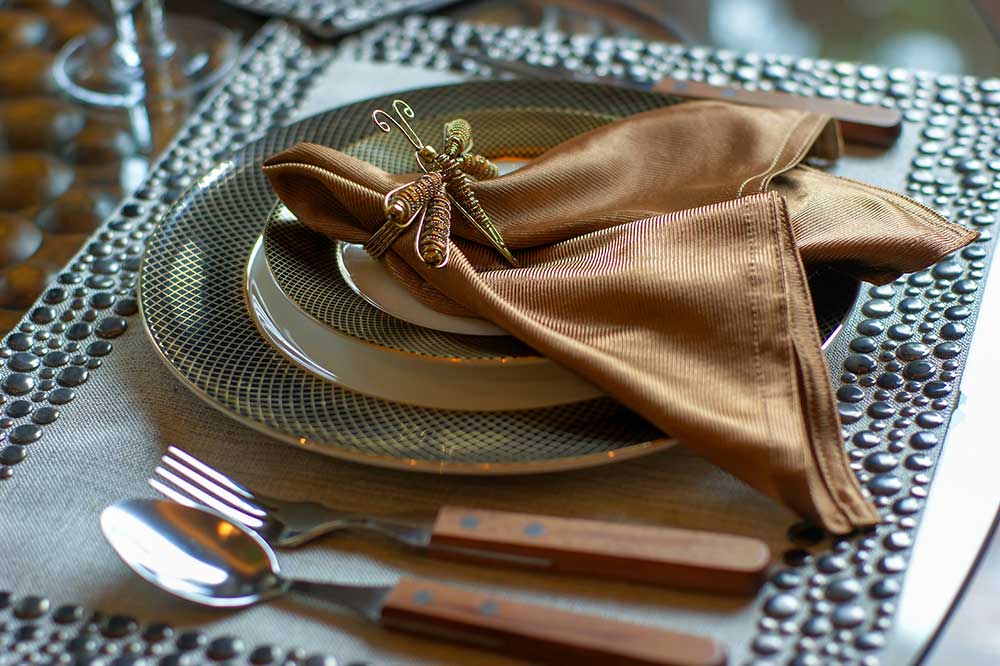 テーブルコーデでパッと目を引く、キャメル色のランチョンマット席札は使いやすいアイテム。人気のナチュラルウェディングにも合う少しカジュアルな雰囲気も魅力です。