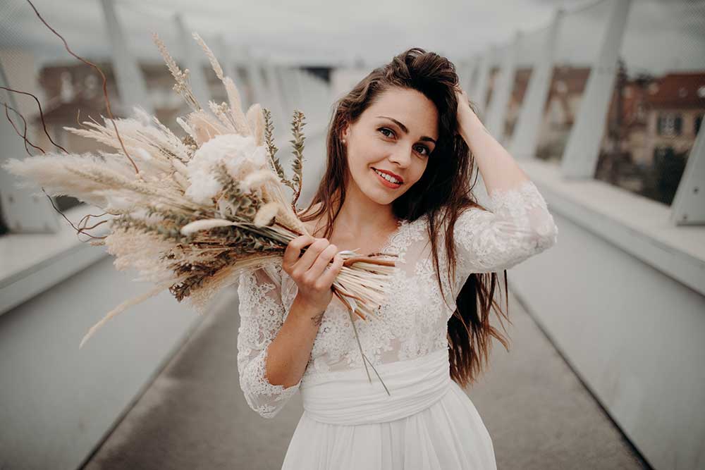 人気のドライフラワーなら、ベージュの淡いトーンのオシャレブーケを作ることもできます。パンパスグラスやラグラスなど、ふわふわがかわいいドライフラワーはウェディングでも人気です。