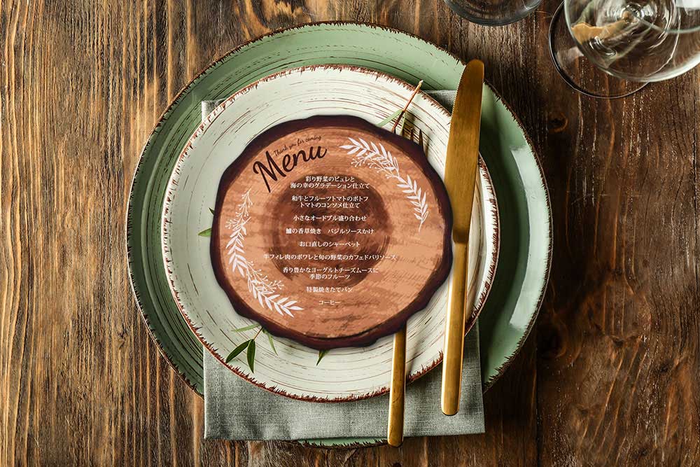 実際に人数分の良い感じの木の切り株を準備するのは難しいですが、リアルな見映えのペーパーアイテムを利用すれば、気軽にナチュラルなテーブルコーデを実現できます。