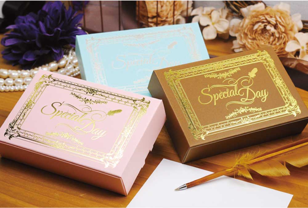 招待状に同封するカードタイプがいい!という方にはボックスに保管できるタイプがオススメ。ボックス付きでもお手頃価格でカワイイものがありますよ。
