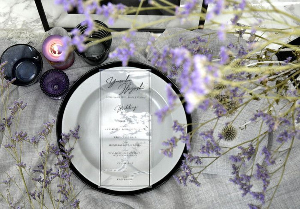 こちらはクリアなアートフィルムの席札&メニュー表。ドライフラワーやナチュラルコーディネートとの相性もぴったり!透明なので背後に置くものとのコーディネートも楽しめてワンランク上の演出が叶います。