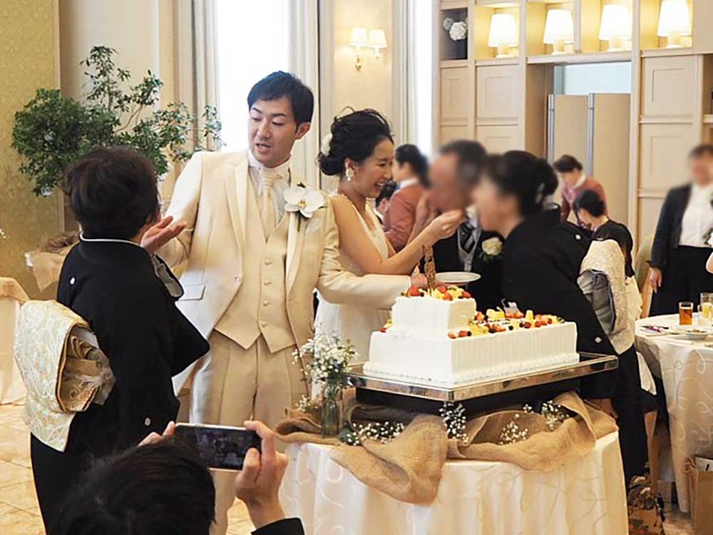 「サンクスバイト」とは、ウェディングケーキを新郎新婦からお世話になった誰かに、感謝の気持ちを込めて食べさせてあげる演出のこと。