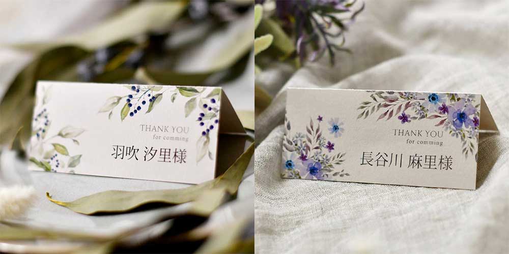 参考:(左)席札完成品オーダー「カルムリーフ」/(右)席札完成品オーダー「カルムフラワー」